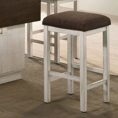 The ultimate in farmhouse charm, perfect for a compact space, this set of two counter height stools are a versatile addition. They boast backless silhouettes and clean, straight frames, all in an antique white finish paired with contrasting dark brown fabric. This eco-friendly frame is constructed from rubberwood, a tropical, solid wood taken from rubber plantations.