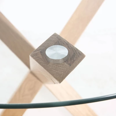 Introduce an element of exquisite style and inviting lightness with this stunning glass dining table. Boasting a wood base crafted in solid rubberwood with an American White oak veneer, three angled posts intersect to create a star-inspired silhouette. A thick round of tempered glass rests on top, allowing an artful focal point to stand front-and-center. Enjoy an indulgent, intimate dinner or create a stylish spot for coffee and a croissant.