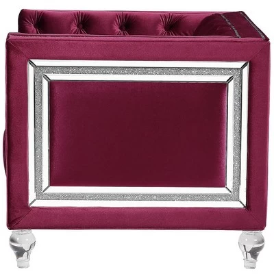 Looking to create a glamorous living room, look no further. The Heibero collection is ideal for that. Featuring timeless button tufting and the more modernized fine details such as the mirrored trim accents. The burgundy velvet upholstery is an eye-catcher. Have the best of both worlds contemporary and classic all in one with this collection. Solidly constructed, this sofa rests securely on four acrylic legs. This collection is a perfect solution for providing seating for you and all your guests.