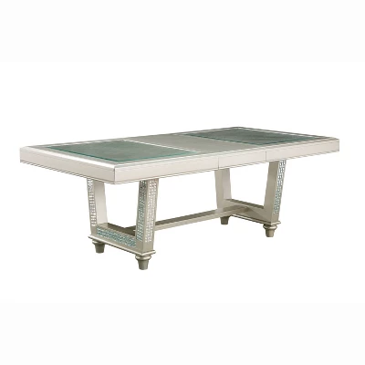 Introduce unparalleled glamour with this seven-piece rectangular dining table set in gold-tone. A stunning centerpiece for your dining room, the table boasts a shimmering champagne finish to complement solid wood and wood veneer construction. Textured details augment a clear tempered glass tabletop that creates a clean, smooth surface for delicious dinners. Chairs boast a contoured back with button tufting over warm gray faux leather for a lush look and feel.