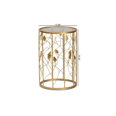 Accent your space with the luxurious and eye catching design of the Anaya end table. Made in China, the Anaya is comprised of a brushed gold finished metal frame fitted with a circular glass tabletop. Inspired by nature, the base showcases a unique leaf and vine design that allows light to easily flow throughout the room. Fully assembled, its slim silhouette makes it well suited for placement next to a sofa or chair. A stunning design that helps brighten any space, the Anaya end table is a fantastic addition to the modern home.