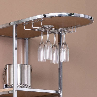 Serve up your favorite drinks in style with the Aiden Lane Befail Serving Table with Bar Storage. Four open shelves keep your bar essentials organized and within reach, while a spacious countertop and glassware rack lets you mix up cocktails with ease. Add this contemporary bar station to your formal dining space to kick start dinner parties, or place in your living space to elegantly entertain family and friends. Your home bar gets a modern upgrade with this two-tone serving table. Overall: 49” W x 15” D x 66.5” H