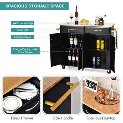 - Multiple Storage Options: This kitchen cart features 2 slide-out drawers under the top to offer hide-away storage for tableware and napkins. 2 large cabinets with 2-tier adjustable shelves allow you to store utensils and appliances with different sizes. You can cook prep or enjoy cocktails, have casual breakfast and eat dinner with friends and family on this large countertop.