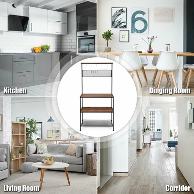Our Baker’s Rack is superior is quality and classic in design! Made of thicken board and iron tubes, the baker’s rack is sturdy and durable for a life span. It also does excellent in rust resistant with paint-coat on it. Adjustable feet provide great stability. 4-layer design, including 3 wooden boards and 1 grid layer, provides ample storage and classified space, making your home tidy and neat. Moreover, 11 S-hooks help to hang up objects like pans and ladles conveniently and effortlessly!