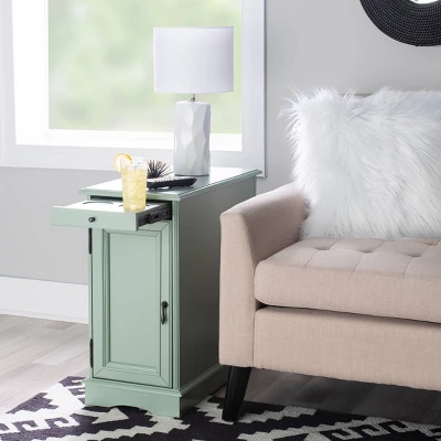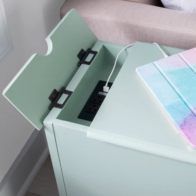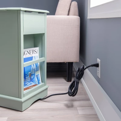 The Felix Accent Table perfectly pairs style and technology in this convenient end table. Sized to fit next to your sofa or your favorite chair, the table has hidden storage behind the cabinet door, and a pull out tray with coasters for your drinks and a spot for your phone or remote. A flip-up top opens to reveal a USB and electrical charging station. Comes in an array of colors to fit any décor. Assembly required, this accent table is easy to assemble and maintain – simply dry dust as needed.