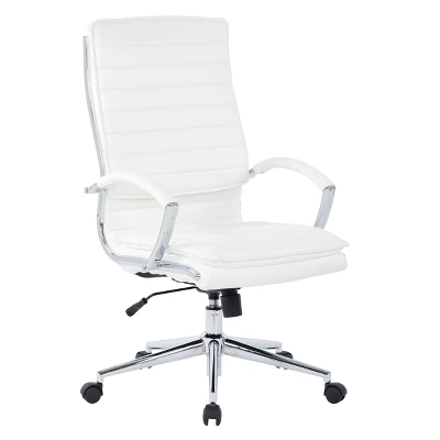 Strap in for a comfortable chair constructed in thick contoured faux leather. Adjustable tilt tension and locking tilt control puts you in charge of this chair’s functionalities. Built-in lumbar support and one-touch pneumatic height adjustment assures relaxing support during heavy work sessions. Beautiful chrome finishes set the presentation for the High Back Manager’s Faux Leather Chair from OSP Home Furnishings.