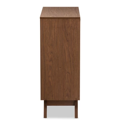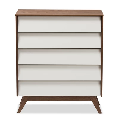 Featuring two-tone finishing in walnut and white, the Hildon is a mid-century modern collection that will attract all of the attentions. The slanted design of the drawers gives it extra character and individual style while the splayed legs showcasing the retro modern look of the collection. Constructed of engineered wood, the Hildon 5-drawer storage chest provides you with extra storage space for your lingerie’s, linen and clothes. Set on four walnut finished legs which elevate the drawers from the floor, this storage chest of slanted drawers are a great addition to any bedroom. The Hildon sets a tone for any room which is what mid century style is all about. Made in Malaysia, the Hildon 5-drawer storage chest requires assembly.