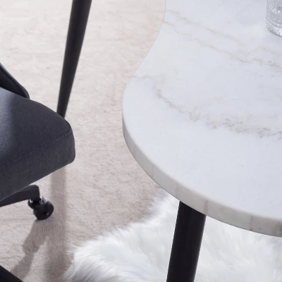 Look no further than the Kinsley Desk to revamp the style of your home office! Built for style as well as function, the desk features a kidney shaped white marble top with ebony canted legs for a look that will impress! The 60″ length offers plenty of workspace. Your purchase includes one desk.
