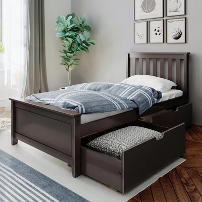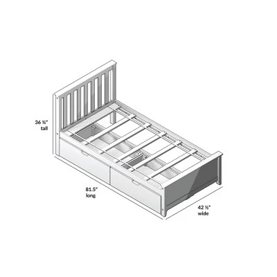 Plenty of room for sleep and play? Now that’s a win-win! The Max & Lily Twin Bed with Under Bed Storage Drawers is the perfect combination of functional and fun that both kids and parents love. Added under bed storage drawers make organizing a breeze. Fits standard twin-size mattresses. Solid, knot-free New Zealand pine wood adds strength and stability. All Max & Lily products use a durable, low VOC finish. The slatted headboard and panel footboard with flush, color-matched hardware give this bed a clean, modern look. Instructions, slat roll, and required hardware are included. With solid plywood slats and a metal support bar, this sleeping surface can support 400 pounds of resting weight. This bed meets or exceeds Federal safety standards for kids furniture. When it’s time for play, this bed’s space saving design frees up plenty of floor space. 2+ adults make assembly simple and easy. The Twin Bed with Under Bed Storage Drawers from Max & Lily offers exceptional quality and affordability that kids and their parents will enjoy for years to come. Max & Lily is a member of the Maxwood family of brands – the kids furniture experts bringing a tradition of superior quality, safety and fun!