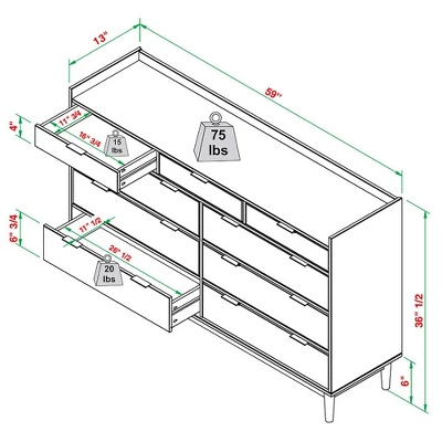 Stylish, luxurious, and practical, Saracina Home’s Mid-Century Modern Solid Wood 9-Drawer Wide Dresser gives you a little bit of everything. Raised, tapered legs give this piece its nostalgic charm, while the nine drawers give it contemporary convenience. Store small accessories in the three narrow top drawers and other wardrobe staples in the six larger drawers. A raised lip around the top surface frames your dĂ©cor and keeps trinkets safely in place. Constructed with solid pine wood that is responsibly sourced from renewable forests, this chest of drawers adds one more sustainable purchase to your bedroom or guest room. Pair this piece with the matching nightstand for a complete set.