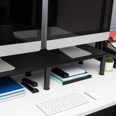Dual Monitor Stand: The Mind Reader Dual Monitor Stand easily supports your heaviest monitor(s), all in one computer/iMac, printers, speakers and more. Works with all types of media devices. Modern design, and sustainable MDF material that will last for years of usage. Optimal Viewing: 4 adjustable heights for your preferred viewing needs. The smallest height is 3.25 inches off the surface, after that you can raise up to 4.5 inches, 5.25 inches and finally a max height of 6.5 inches from the surface. Set your preferred height according to your office chair or your most comfortable optimal viewing. All legs are adjustable. Stays in Place: Equipped with rubber grippers for all legs in order to keep the organizer stand in place. Donโt worry about your stand sliding all over the place when in use or when adding monitors, TVโs, speakers, or any other media devices. Ergonomic Stand for Health Benefits: Clinical studies show the best height for your monitor is to have your eyes level with the top edge of the computer screen. However, most people stare at monitor screens that are too low. If you seem to bend your neck or hunch over to look down at your computer screen, we found the solution for you. Our monitor riser will finally put your computer screen at the correct height needed to reduce neck strain. Specifications: Color: Black. Material: MDF (Medium Density Fibreboard). Assembly Required? Minimal assembly is required, (2-minute assembly). Dimensions: 11โ L x 38.5โ W x 6.โ H.