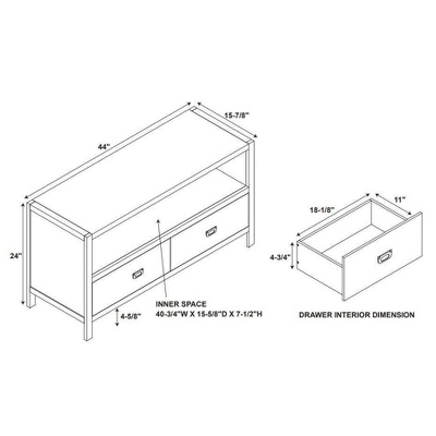 - Two drawers and one open shelf