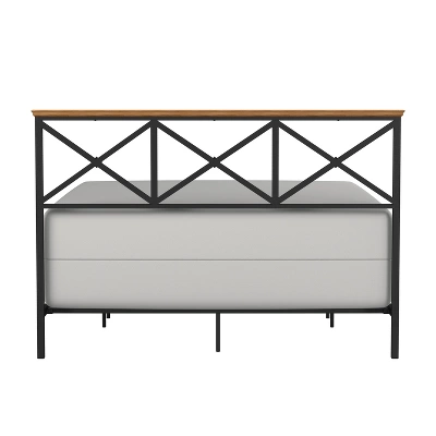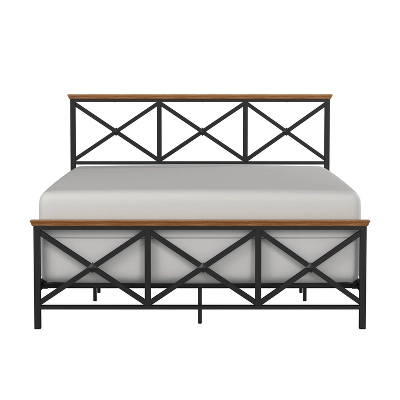 Metal beds are all the rage, this innovative queen size bed proves why. Designed for support and style, the black metal frame has wood top accents on the head and footboards adding charm and a mixed media appeal. This bed features a farmhouse-inspired scheme with a X-shaped design throughout turning your area into a rustic and welcoming resting space. The metal side rails and support legs, provide your box spring and mattress with complete stability and comfort. Box spring and mattress required; not included. Assembly required.