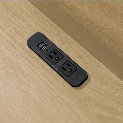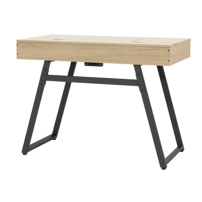 The perfect combination of modern style and functional features, the Rockdale Laptop Multi-Compartment Laptop Desk with Charging Station offers storage solutions and a built-in power supply strip to keep your laptop, phone, and other accessories charged. Designed for small spaces, this office desk has a drawer and tops that lift so you can store items to clear your workspace. The hinges on these storage compartments are soft-close for safety. Cord management holes allow you to organize and run your power cords to the USB and 3-prong power outlets in the back compartment. Cutouts on the lifting tops make them easy to maneuver. The powder-coated metal and durable vinyl laminate tops are scratch-resistant. Ideal as a standard writing desk or laptop computer, this desk is available in Honey Maple or Shorecrest gray.