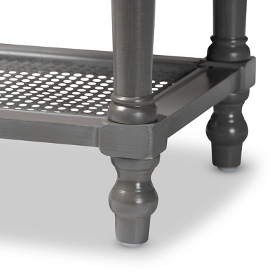 Accommodate your household needs with the timeless design of the Mahoney end table. Made in China, this end table is crafted from sturdy wood with a neutral gray finish that blends well with modern spaces. One drawer offers secure storage for household essentials, while the woven synthetic rattan shelf creates a convenient display for larger items. Requiring assembly, the Mahoney is supported by ring-turned legs for stable support that lends a sophisticated feel. An antique brass finished metal drawer knob adds a vintage touch, making the Mahoney end table a simple yet classy addition to any space. Dimensions: 23.60″ High x 15.70″ Wide x 13.80″ Deep; Drawer Dimensions: 4.70″ High x 11.00″ Wide x 10.40″ Deep; Shelf Dimensions: 11.20″ High x 13.80″ Wide x 12.60″ Deep; Legs: 3.3″High;