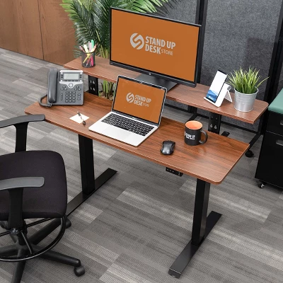 The Stand Up Desk Store Programmable Electric Two-Tier Compact Standing Desk makes a great small office desk or small home office desk. Highlights include a programmable electric keypad that lets you recall your favorite sitting and standing height with the push of a button. A unique, independently adjustable split desktop includes a main desktop section as well as an adjustable monitor shelf. Featuring four possible positions, the monitor shelf can be set at 0″ (flush), 1.75″, 3.5″, or 5.25″ above the main desktop. Overall dimensions are 47.25″ W x 24″ D x 28.3″ to 52.6″ H. Max weight capacity is 154 lbs. Durable powder-coated steel legs. 5-year limited warranty against defects. Stand Up Desk Store is based in the suburbs of Chicago.