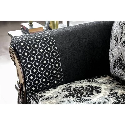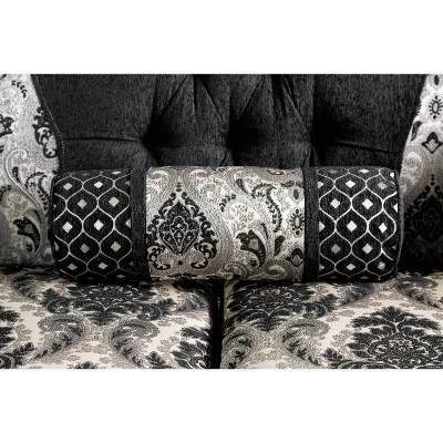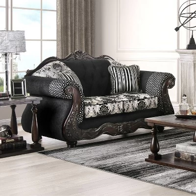 Give your classic style home a traditional parlor with a black Victorian loveseat. The curvaceous brown varnished wood frame is an aristocratic layout with a robust base buttressed on bun feet. Etched details add elegance to complement the damask patterned cushions and ogee patterned rolled armrests. Striped pillows with tassel edge complete the opulent seat.
