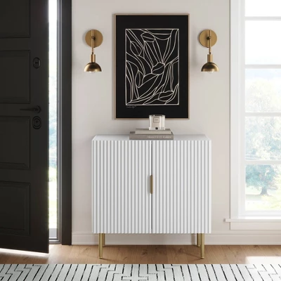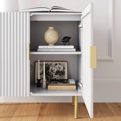 - Vera is a bright and glamorous storage cabinet with fluted textured front and sides, paired with elegant brass gold legs.